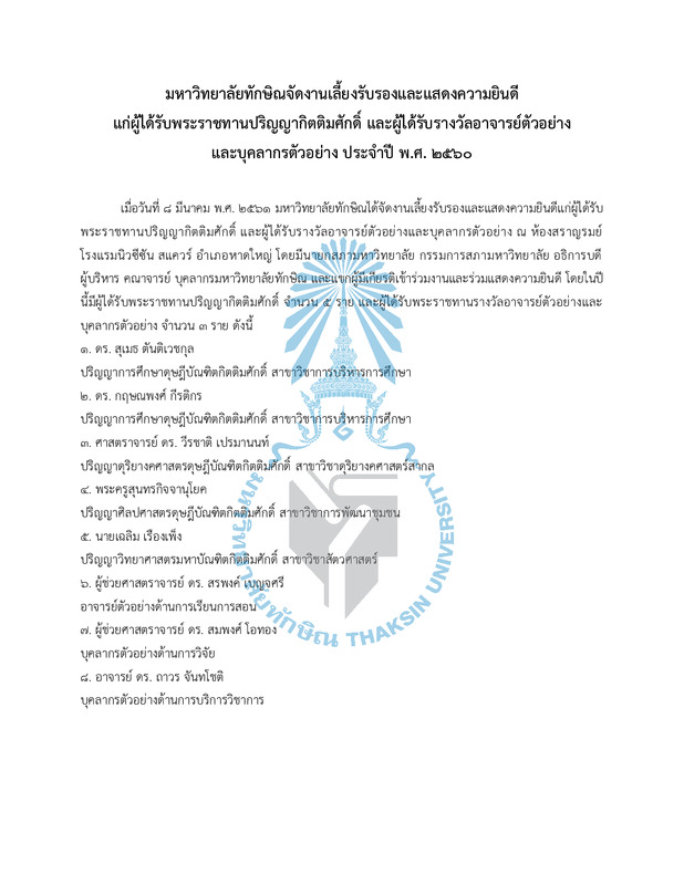 มหาวิทยาลัยทักษิณจัดงานเลี้ยงรับรองและแสดงความยินดี แก่ผู้ได้รับพระราชทานปริญญากิตติมศักดิ์ และผู้ได้รับรางวัลอาจารย์ตัวอย่าง และบุคลากรตัวอย่าง ประจำปี พ.ศ. 2560 วันที่ 8 มีนาคม พ.ศ. 2561
