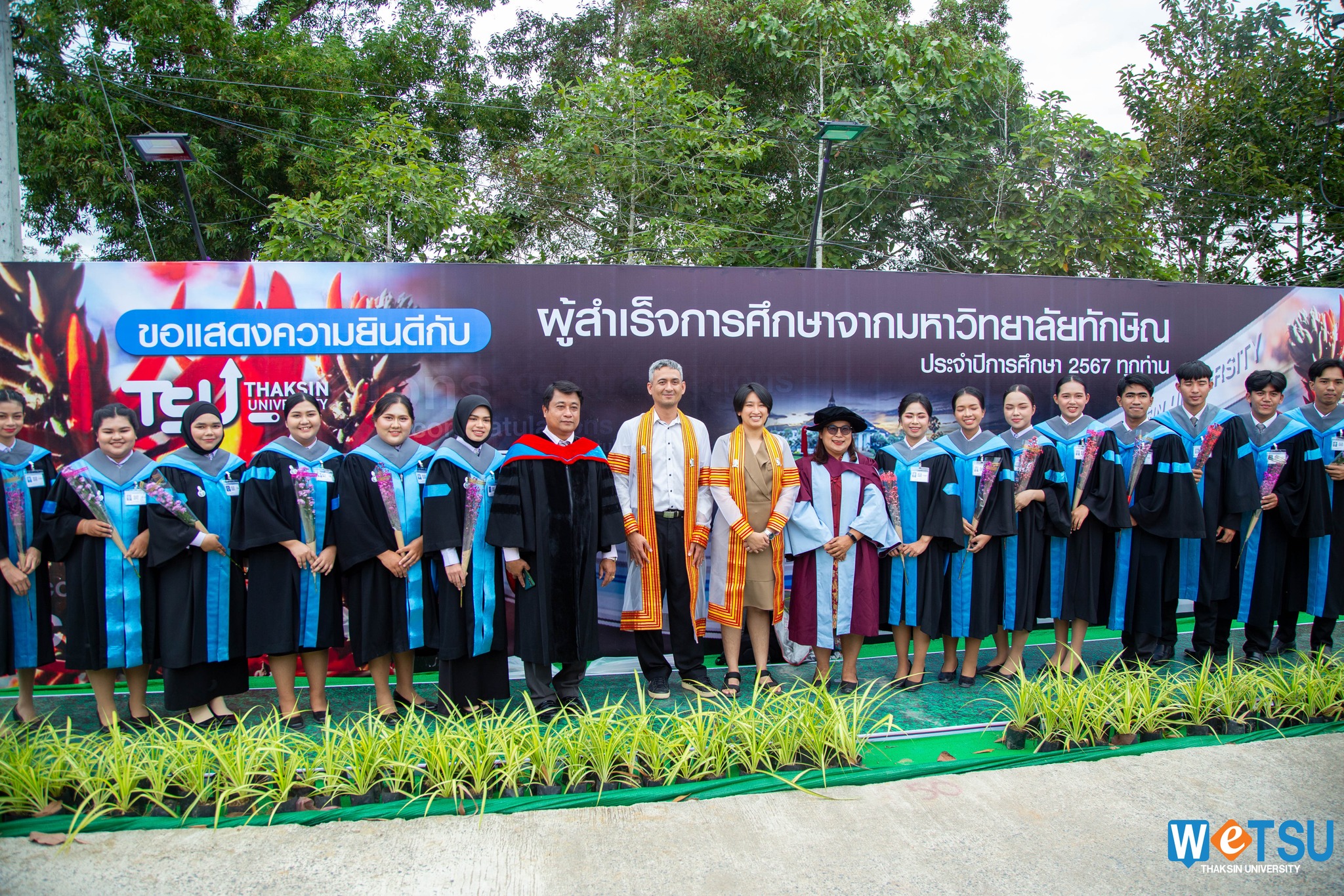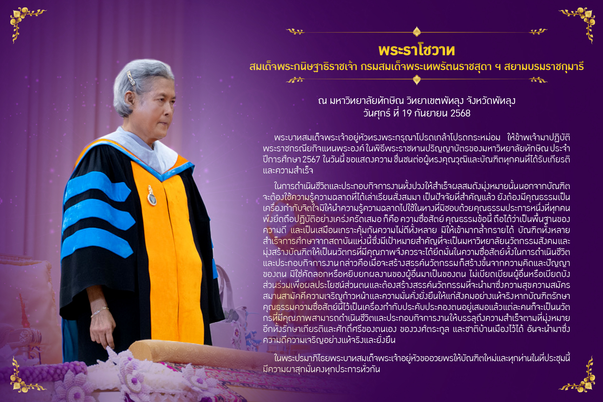 วันศุกร์ที่ 19 กันยายน พ.ศ. 2567 ณ หอประชุมเฉลิมพระเกียรติ มหาวิทยาลัยทักษิณ วิทยาเขตพัทลุง อำเภอป่าพะยอม จังหวัดพัทลุง พระบาทสมเด็จพระเจ้าอยู่หัว ทรงพระกรุณาโปรดเกล้าโปรดกระหม่อม ให้สมเด็จพระกนิษฐาธิราชเจ้า กรมสมเด็จพระเทพรัตนราชสุดา ฯ สยามบรมราชกุมารี เสด็จพระราชดำเนินแทนพระองค์ ในการพระราชทานปริญญาบัตรแก่ผู้สำเร็จการศึกษาจากมหาวิทยาลัยทักษิณ ประจำปีการศึกษา 2567 ณ หอประชุมเฉลิมพระเกียรติ มหาวิทยาลัยทักษิณ วิทยาเขตพัทลุง อำเภอป่าพะยอม จังหวัดพัทลุง ในปีนี้มีผู้สำเร็จการศึกษาจากมหาวิทยาลัยทักษิณ รวมทั้งสิ้น จำนวน 3,669 คน ภายหลังเสร็จพิธีพระราชทานปริญญาบัตร มหาวิทยาลัยทักษิณได้นำเสนอการแสดงจินตลีลาประกอบบทเพลง “70 ปี ดวงแก้วของแผ่นดิน”เพื่อเฉลิมพระเกียรติสมเด็จพระกนิษฐาธิราชเจ้า กรมสมเด็จพระเทพรัตนราชสุดา ฯ สยามบรมราชกุมารี เนื่องในวโรกาสครบรอบ 70 พรรษา พร้อมทั้งให้สร้างสรรค์ชุดการแสดงเพื่อแสดงถวายหน้าพระที่นั่งในโอกาสวันพระราชทานปริญญาบัตร