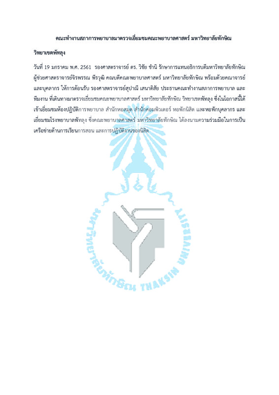 วันที่ 19 มกราคม พ.ศ. 2561 รองศาสตราจารย์ ดร. วิชัย ชำนิ รักษาการแทนอธิการบดีมหาวิทยาลัยทักษิณ ผู้ช่วยศาสตราจารย์จิรพรรณ พีรวุฒิ คณบดีคณะพยาบาลศาสตร์ มหาวิทยาลัยทักษิณ พร้อมด้วยคณาจารย์ และบุคลากร ให้การต้อนรับ รองศาสตราจารย์สุปาณี เสนาดิสัย ประธานคณะทำงานสภาการพยาบาล และทีมงาน ที่เดินทางมาตรวจเยี่ยมชมคณะพยาบาลศาสตร์ มหาวิทยาลัยทักษิณ วิทยาเขตพัทลุง ซึ่งในโอกาสนี้ได้เข้าเยี่ยมชมห้องปฏิบัติการพยาบาล สำนักหอสมุด สำนักคอมพิวเตอร์ หอพักนิสิต และหอพักบุคลากร และเยี่ยมชมโรงพยาบาลพัทลุง ซึ่งคณะพยาบาลศาสตร์ มหาวิทยาลัยทักษิณ ได้ลงนามความร่วมมือในการเป็นเครือข่ายด้านการเรียนการสอน และการปฏิบัติงานของนิสิต