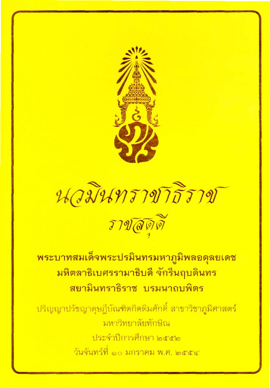 นวมินทราชาธิราช ราชสดุดี พระบาทสมเด็จพระปรมินทรมหาภูมิพลอดุลยเดช มหิตลาธิเบศรามาธิบดี จักรีนฤบดินทร สยามินทราธิราช บรมนาถบพิตร ปริญญาปรัชญาดุษฎีบัณฑิตกิตติมศักดิ์ สาขาวิชาภูมิศาสตร์ มหาวิทยาลัยทักษิณ ประจำปีการศึกษา 2552 วันจันทร์ที่ 10 มกราคม พ.ศ.2554