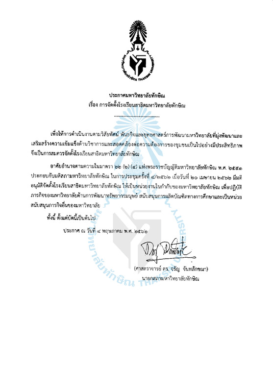 ประกาศมหาวิทยาลัยทักษิณ เรื่อง การจัดตั้งโรงเรียนสาธิตมหาวิทยาลัยทักษิณ