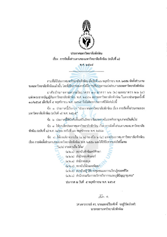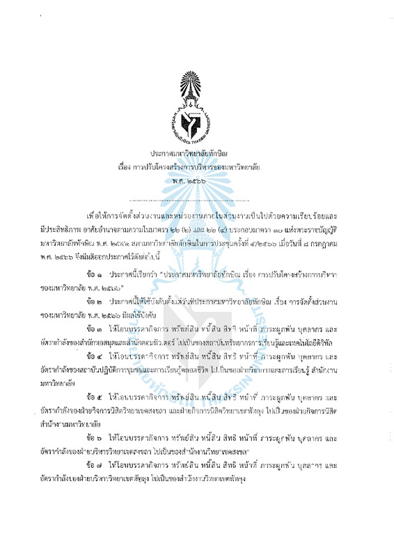 ประกาศมหาวิทยาลัยทักษิณ เรื่อง การปรับโครงสร้างการบริหารของมหาวิทยาลัย พ.ศ. 2566