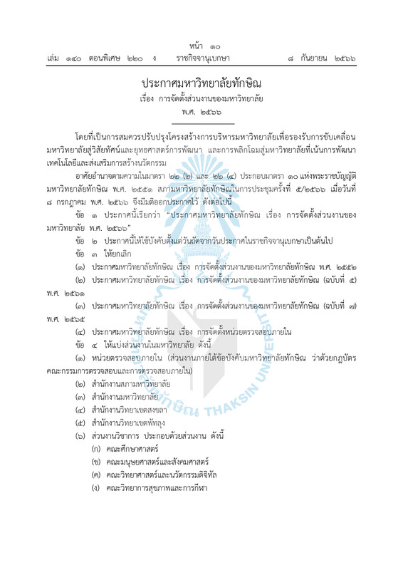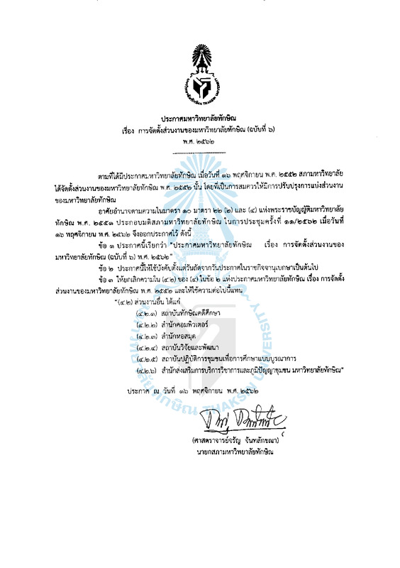 ประกาศมหาวิทยาลัยทักษิณ เรื่อง การจัดตั้งส่วนงานของมหาวิทยาลัย พ.ศ. 2566