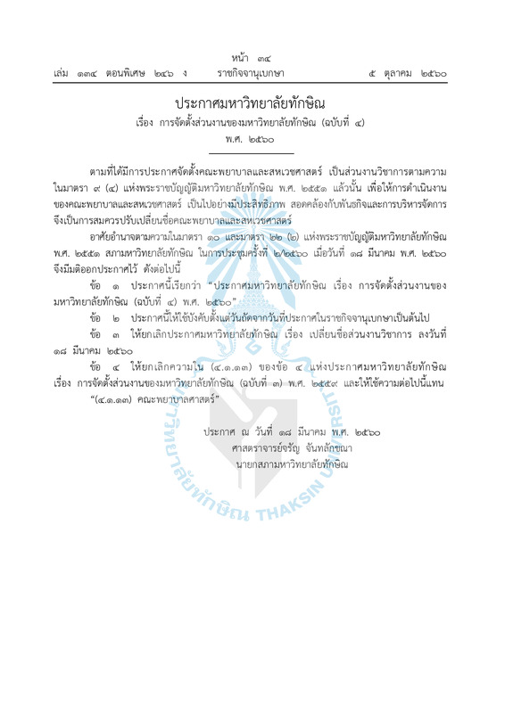ประกาศมหาวิทยาลัยทักษิณ เรื่อง การจัดตั้งส่วนงานของมหาวิทยาลัยทักษิณ (ฉบับที่ 4) พ.ศ. 2560