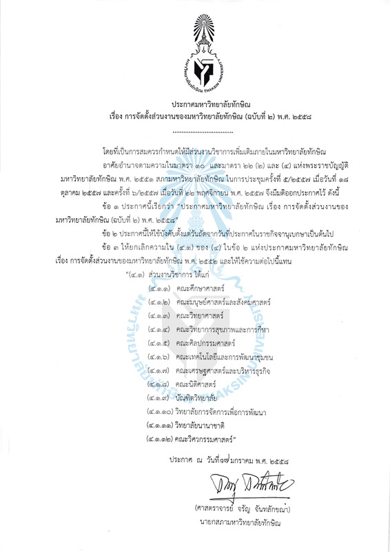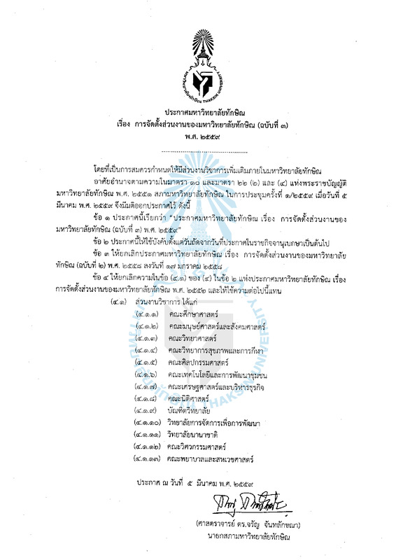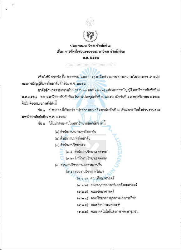 ประกาศมหาวิทยาลัยทักษิณ เรื่อง การจัดตั้งส่วนงานของมหาวิทยาลัยทักษิณ พ.ศ. 2552