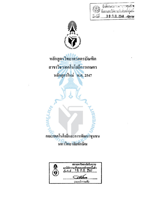 หลักสูตรวิทยาศาสตร์บัณฑิตสาขาวิชาเทคโนโลยีการเกษตร หลักสูตรใหม่ พ.ศ.2547 ประกาศ ณ วันที่ 16 กุมภาพันธ์ 2541